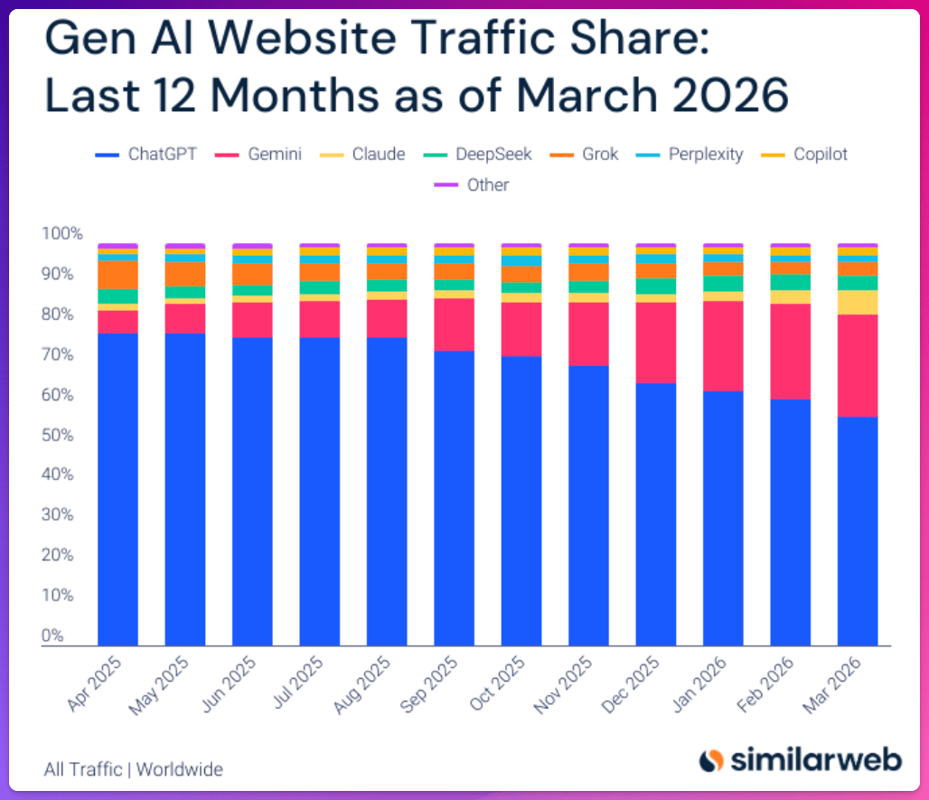 Der Google-Kosmos macht aktuell an Boden gut. Die neuen Similarweb-Zahlen aus Q1 2026 bestätigen das: ChatGPT ist von 87,2 auf 68 Prozent Web-Marktanteil gesunken, während Gemini von 5,4 auf 18,2 Prozent zugelegt hat.