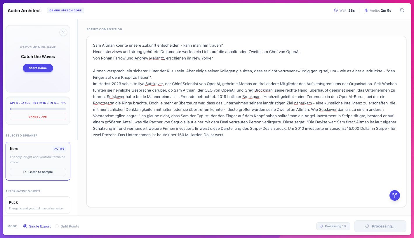 Der Kontext: letzte Woche haben wir den Monster-New-Yorker-Artikel über Sam Altman von ElevenLabs auf Englisch vertonen lassen. Ergebnis: schön. Aber das 90 Minuten-Audio hat in einem Aufwisch unser gesamtes $5-Monatsbudget verbraten!