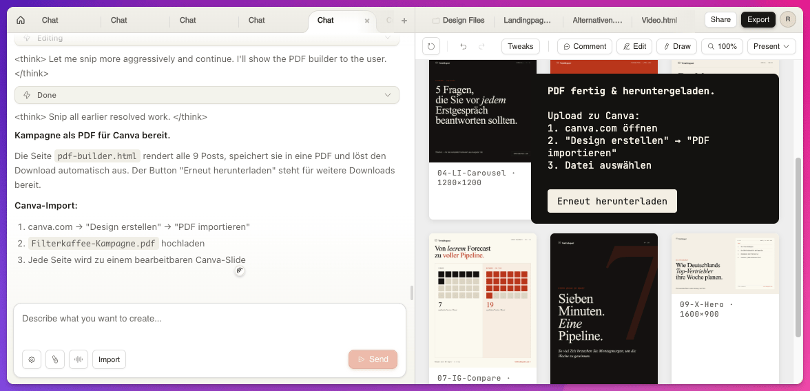 Wir wollten es aber auch für Social-Media-Inhalte ausprobieren. Der praktische Workflow in der Theorie: in Claude Design den visuellen Entwurf machen, dann Export nach Canva und dort finalisieren. Zwei AI-Systeme hintereinander.