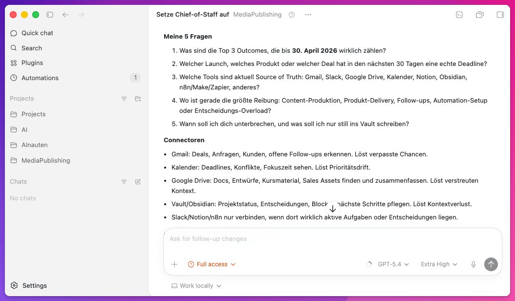 Der zweite Aha-Moment kommt, wenn Codex im Hintergrund mitlernen kann. Dafür richten wir uns einen Assistenten ein (oder du darfst dem auch “Chief of Staff” sagen, wenn du es fancy magst).