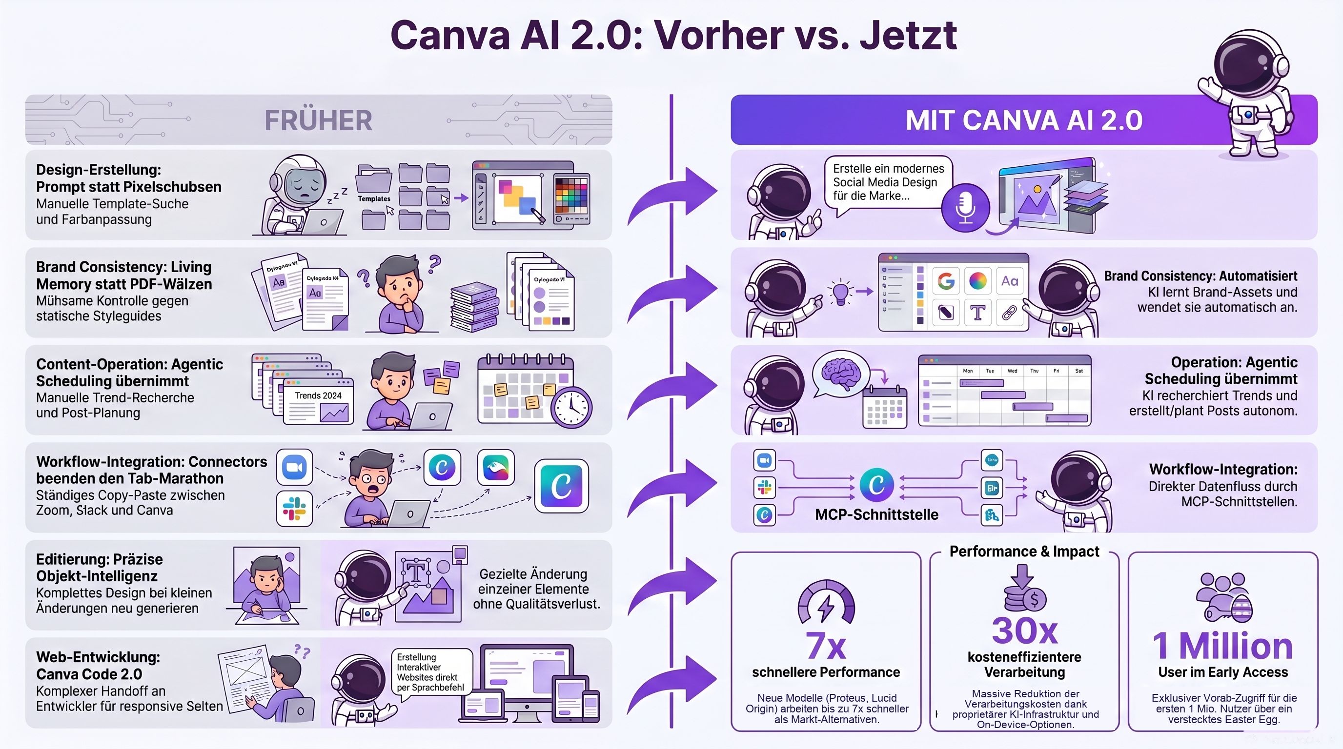 Apropos Canva: auf der Canva Create 2026 wurde gerade die AI 2.0 vorgestellt. Sechs neue Workflows (Connectors, Scheduling, Web Research, Brand Intelligence, Sheets AI, Canva Code 2.0), alles auf dem neuen Canva Design Model - das erste Foundation-Modell, das die Struktur von echtem Design versteht.