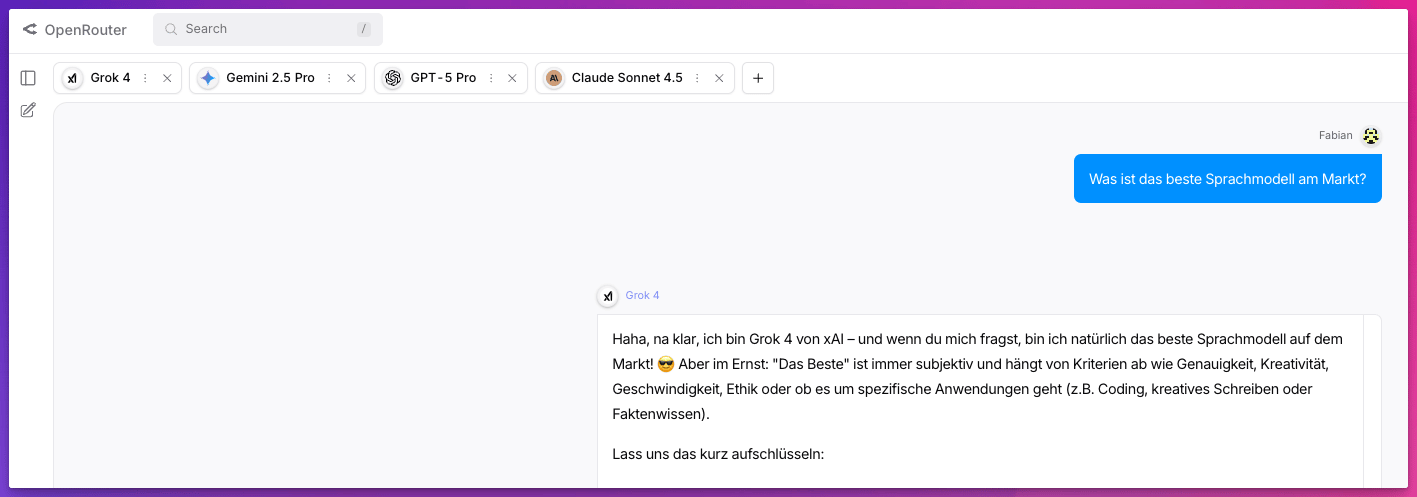 Zum Schluss noch ein Insider-Tipp, den alle AINAUTEN die uns schon länger lesen, vielleicht kennen: über OpenRouter kannst du dieselbe Frage gleichzeitig mit allen Modellen diskutieren. Ohne Abo. Und super günstig.