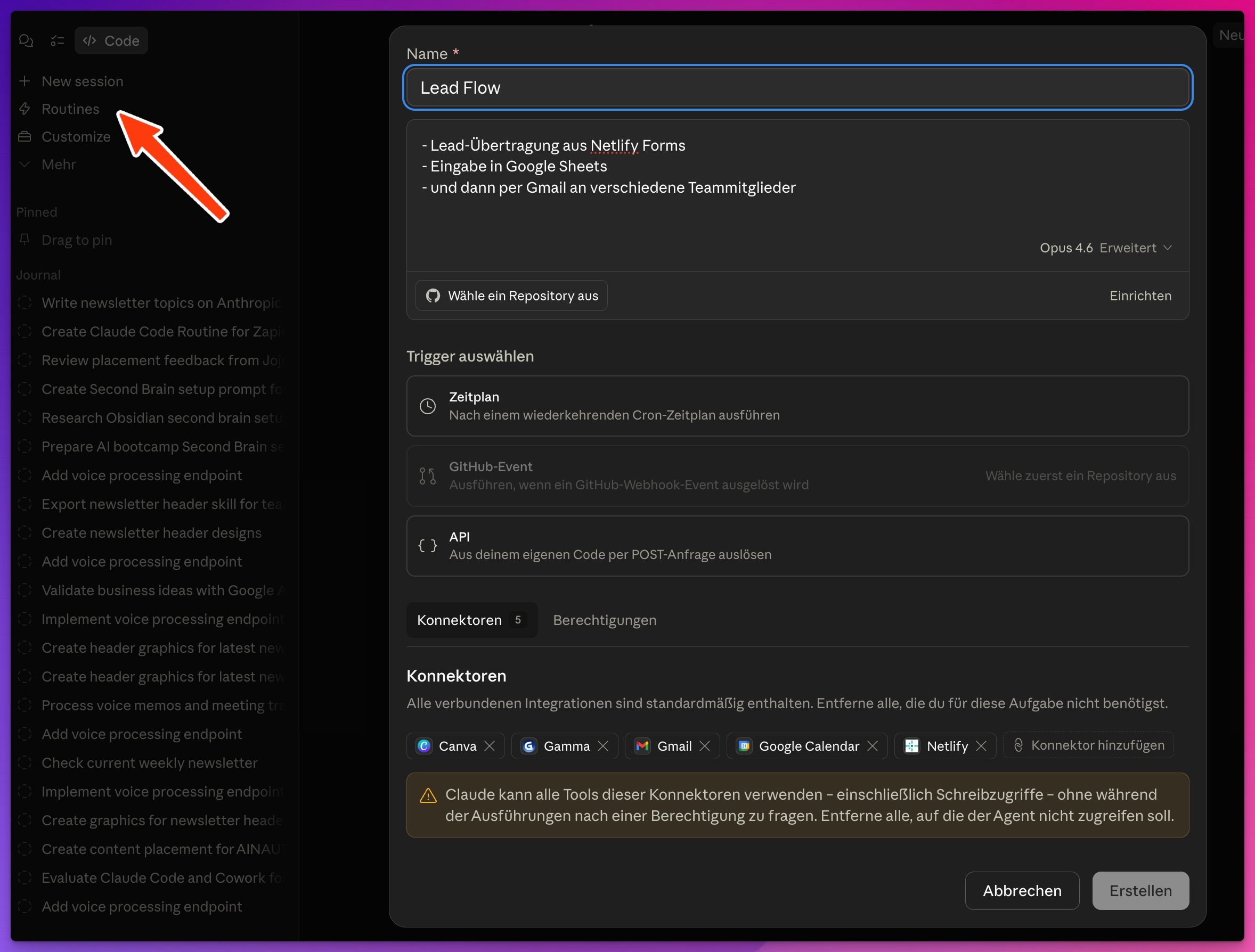 Routines können sich dann bei allen Connectors bedienen, die du bereits in deinem Claude Code hast. Sehr simpel und mächtig zugleich.