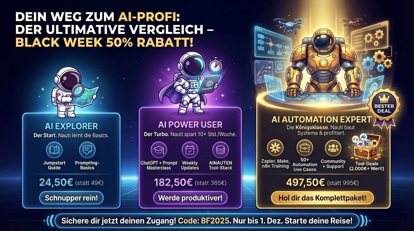 AI POWER USER (€182,50 statt €365) macht dich zum Profi. Alles aus dem AI EXPLORER, plus neue ChatGPT Masterclass, Prompting Pro Bootcamp, unser AI-Tool-Stack - plus 50+ AI-Deep-Dives mit wöchentlichen Updates.