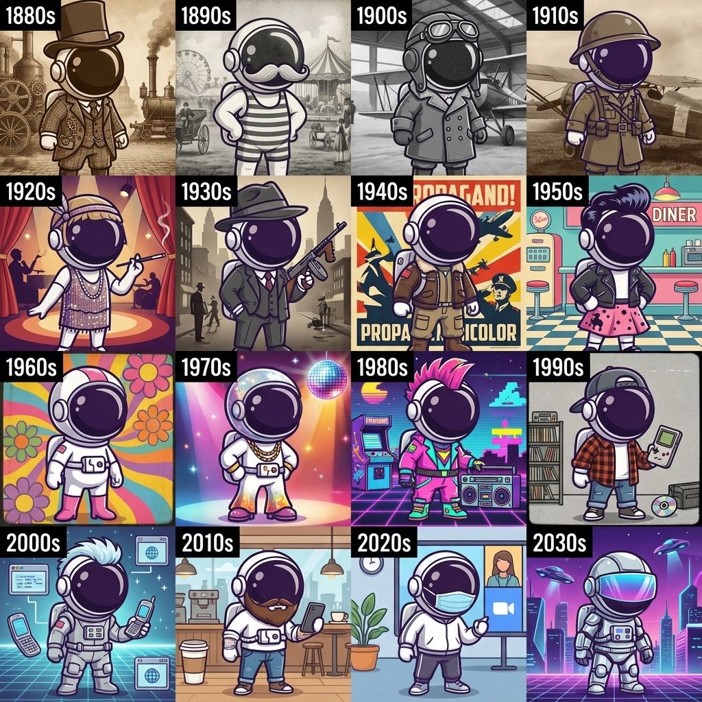 Make a 4×4 grid starting with the 1880s. In each section, I should appear styled according to that decade (clothing, hairstyle, facial hair, accessories). Use colors, background, & film style accordingly.