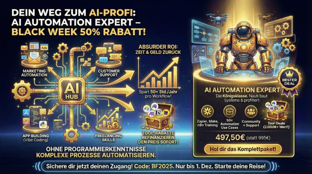 ⭐⭐⭐⭐⭐ AI AUTOMATION EXPERT: Die Königsklasse. Alle unsere Trainings aus AI EXPLORER und AI POWER USER! Plus Community mit Support. Baue Systeme, die 24/7 für dich arbeiten - mit Zapier, Make, n8n Trainings, Vibe Coding, 50+ Use Cases und Tool-Rabatte. Mehr erfahren »