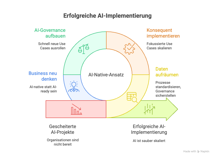 Starre Prozesse. Isolierte Daten-Silos. Teams, die Tools haben, aber nicht wissen, wie sie diese sinnvoll einsetzen. Viele AI-Projekte schaffen es nie über die Pilotphase hinaus. Nicht weil die Technologie versagt. Sondern weil die Organisation nicht mitzieht.