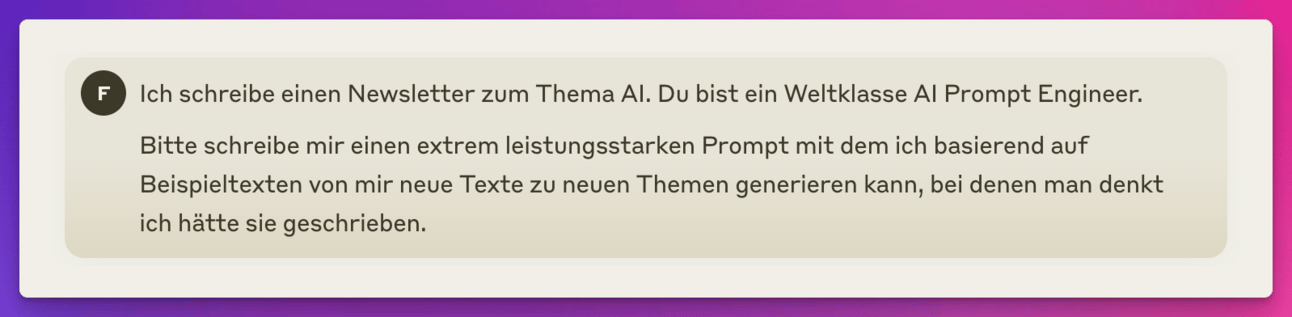 Und hier das Prompt-Ergebnis, mit dem du dein eigentliches Ziel erreichst – Texte zu produzieren, die sich so lesen, als hättest du sie selbst geschrieben!