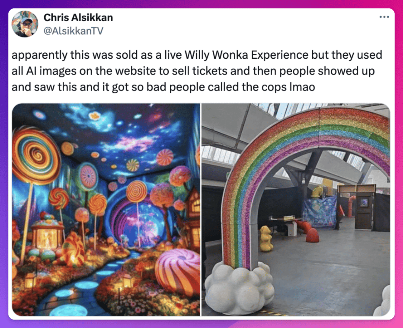 Das verdeutlicht auch gut das Problem der generativen AI: Werbung und Realität driften immer weiter auseinander, wie dieses Willy Wonka Beispiel zeigt. Die Polizei wurde gerufen, und ein Besucher hat die Location sogar mit einem „Meth-Lab“ verglichen …