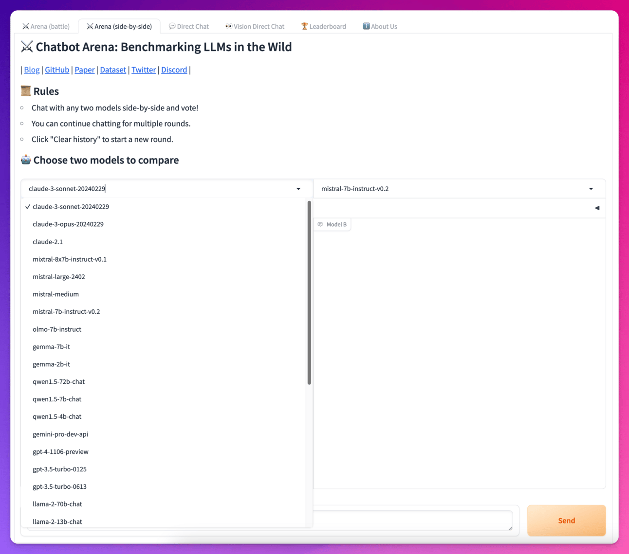 Alternativ und vollkommen kostenlos kannst du auch die Chatbot Arena nutzen, und das sogar ohne VPN. Das ist ziemlich cool, denn nebst Claude Sonnet UND Opus sind dort auch viele andere Modelle wie GPT-4, Gemini Pro, Mistral etc. kostenlos (!) verfügbar und können parallel getestet werden!
