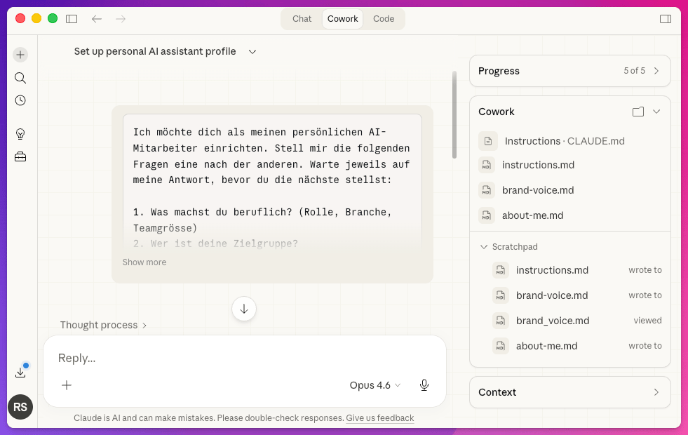 Es wird erst richtig spannend, wenn Claude deinen Kontext kennt. Nicht metaphorisch, sondern praktisch. Es schreibt deine E-Mails in deinem Ton. Es erstellt Content in deiner Brand Voice. Es denkt bei Strategie-Fragen mit, weil es dein Business versteht.