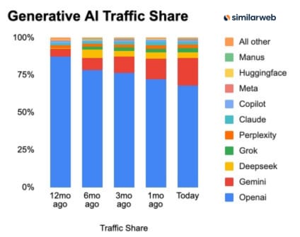 Aber während alle auf OpenAI schauen, baut Google sein Imperium um. Die Zahlen sprechen eine deutliche Sprache: Gemini hat seinen Marktanteil in einem Jahr verdreifacht - von 5,4% auf fast 20%. ChatGPT? Rutschte von 87% auf unter 70%. Autsch…