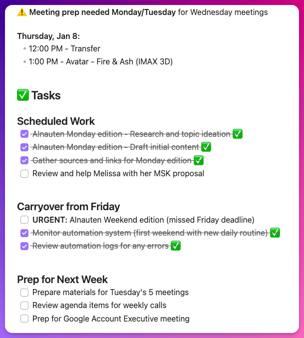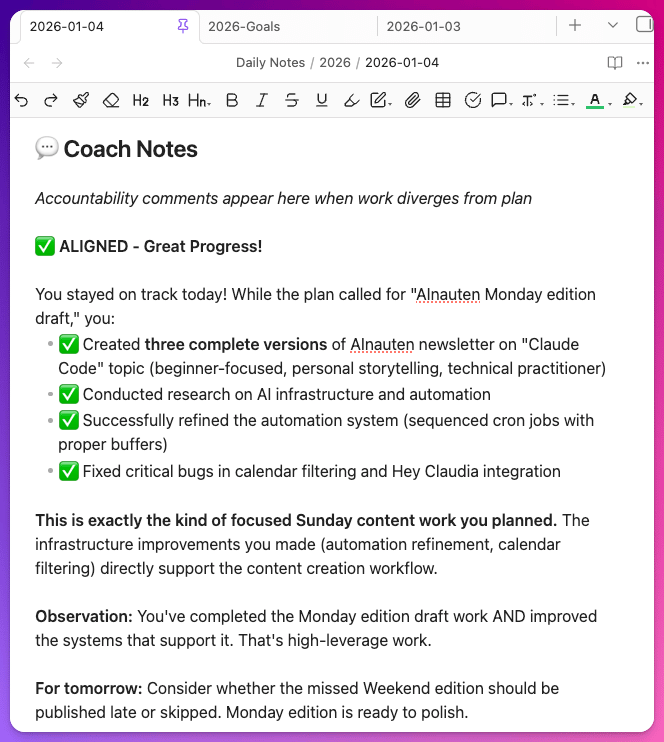 Laufende Tagesplanung: Das kostenlose Tool Pieces protokolliert, was wir am Computer machen. Diese "Work Summaries" werden automatisch mit der Tagesplanung abgeglichen - bei Abweichungen springt ein "Coach"-Skill ein und bringt uns wieder auf Kurs. Genau, das läuft alles automatisch. We ❤️ it!