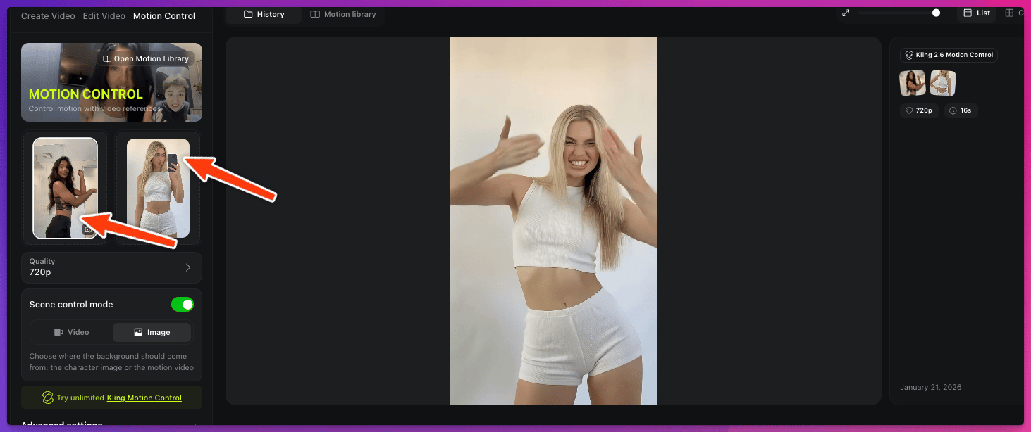 Du siehst einen viralen Trend auf TikTok? Lade einfach das Video hoch und dein AI Influencer macht exakt die gleichen Moves.