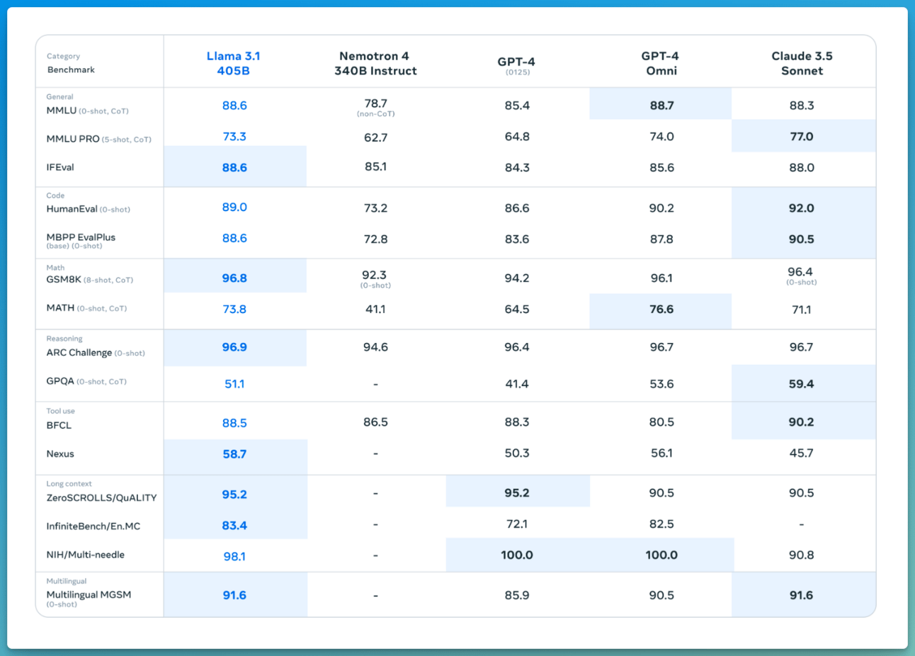 Das spannende ist dieses Mal aber nicht, dass es die anderen alt aussehen lässt. Sondern, dass es so gut ist, ABER auch Open Source. Sprich: jeder kann Llama 3.1 (wie auch schon die Vorgänger) kostenlos nutzen und für sein Zwecke trainieren.
