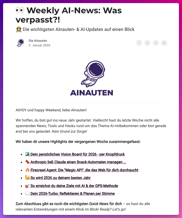 Unsere Samstagsausgabe z.B. wird auch durch AI & Automation unterstützt. Wir sammeln über die Woche die spannendsten Themen und Links aus dem Netz. Dann lassen wir daraus eine passende Zusammenfassung erstellen und machen den finalen Feinschliff von Hand.
