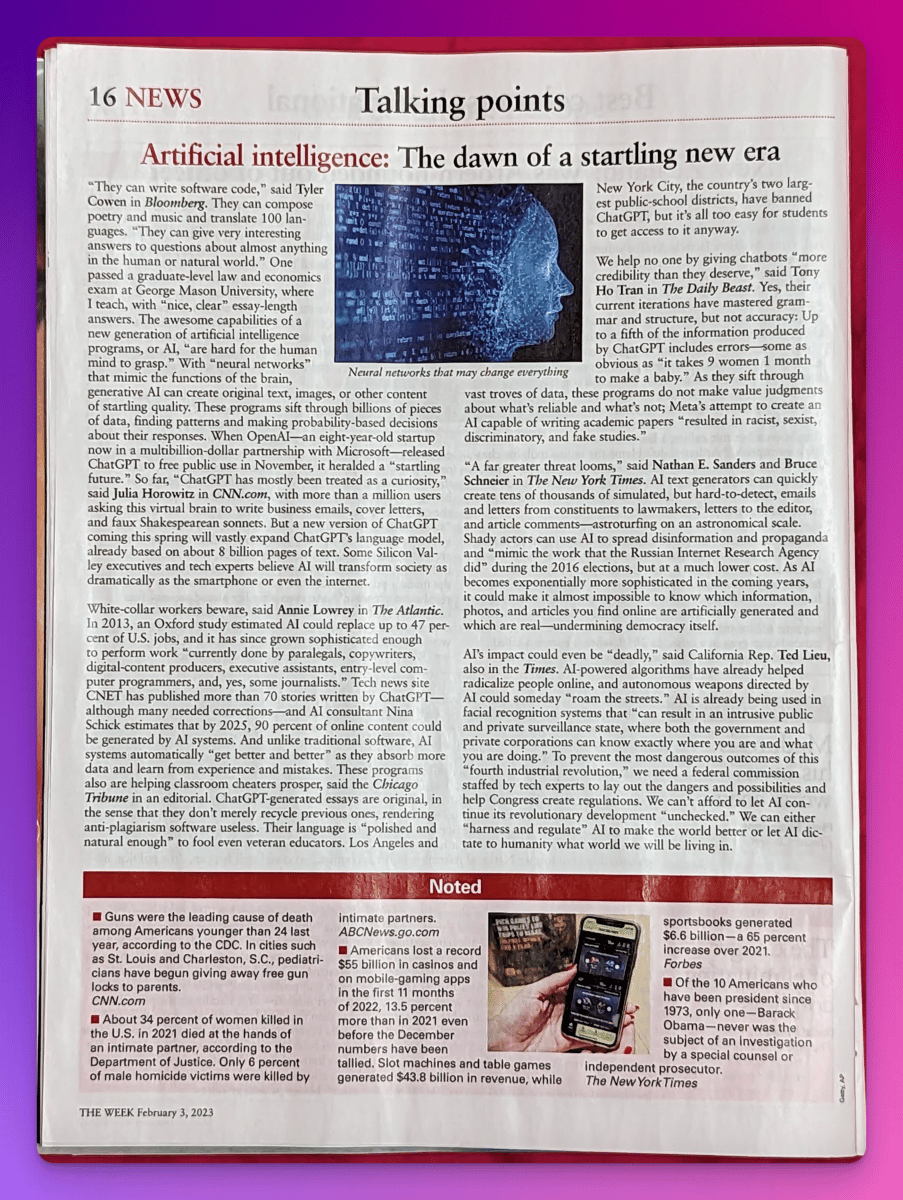 Aber zurück zum Thema. Das Cover wartet mit einer klaren Prophezeiung auf, die wir unterstreichen: “Eine neue Intelligenz - wie AI die Arbeit, Schule, Kunst, Politik und fast alles verändern wird.”