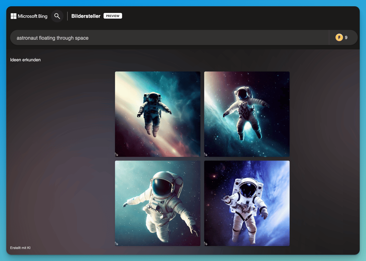 Wichtig: Obwohl das Interface selbst schon komplett auf Deutsch ist, unterstützt der eigentliche Image Creator noch kein Deutsch. Hier musst du also noch mit englischen Prompts arbeiten.