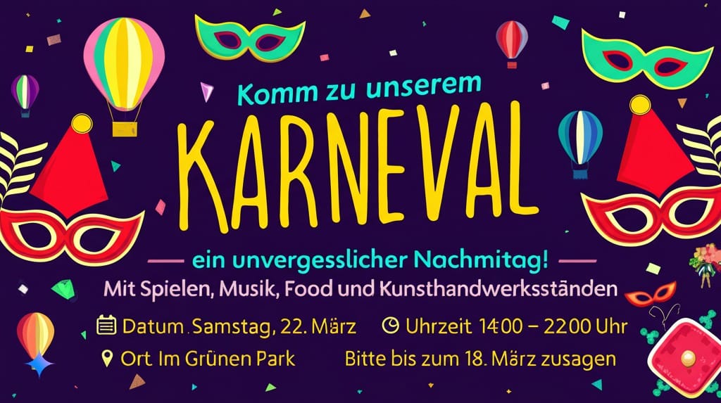 Ein wunderschönes, horizontal ausgerichtetes Einladungsposter im Format 16:9 mit dunklem Hintergrund für einen Karneval. Große, fette Schrift mit passenden Visuals zum Karnevalsthema.