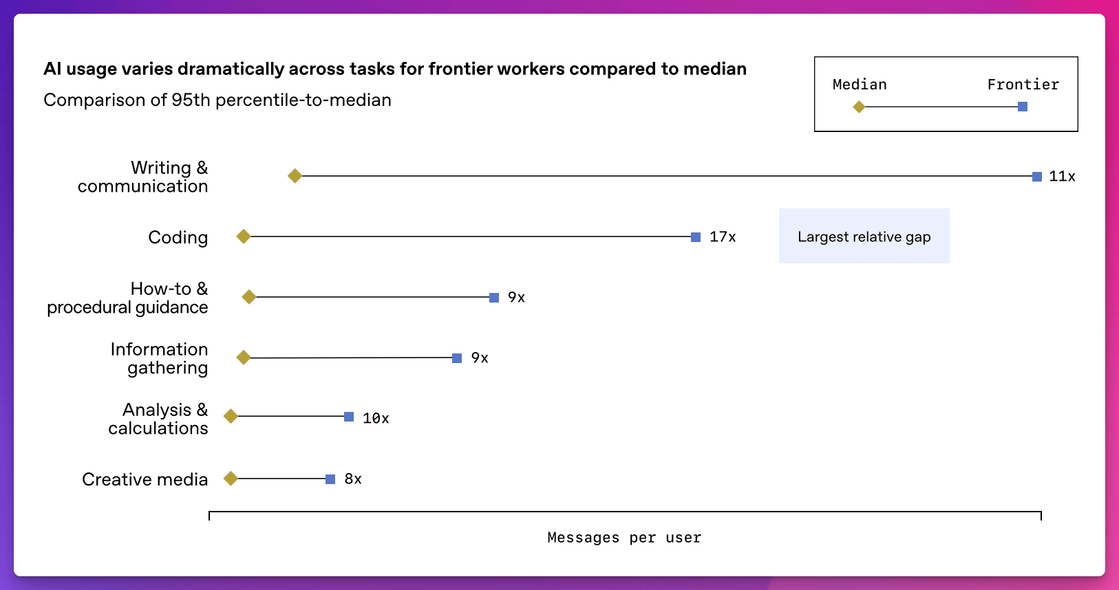 Die 5% High Performer nutzen ChatGPT 11x mehr im Bereich Kommunikation als der Median. Coding 17x mehr. Analyse 10x mehr.