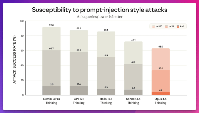 Sogenannte Prompt Injection Attacks werden besonders für Browser, in denen Agenten für uns arbeiten, immer gefährlicher. Hier ist Claude Opus 4.5 auch mit Abstand am stabilsten und am wenigsten anfällig.