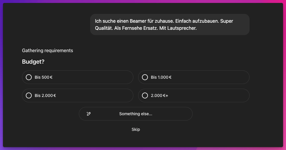 Sobald es genug Infos hat und weiß, was du möchtest, legt es los: Es durchforstet sämtliche Produkte und macht dir eine perfekte Bewertung fertig. Ziemlich genial.