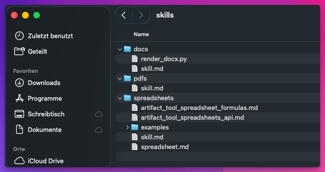 Wann immer du in ChatGPT einen der folgenden Dateitypen anfragst, wird automatisch auf den Skill zugegriffen. ChatGPT schaut sich die Dokumentation an und legt dann los.