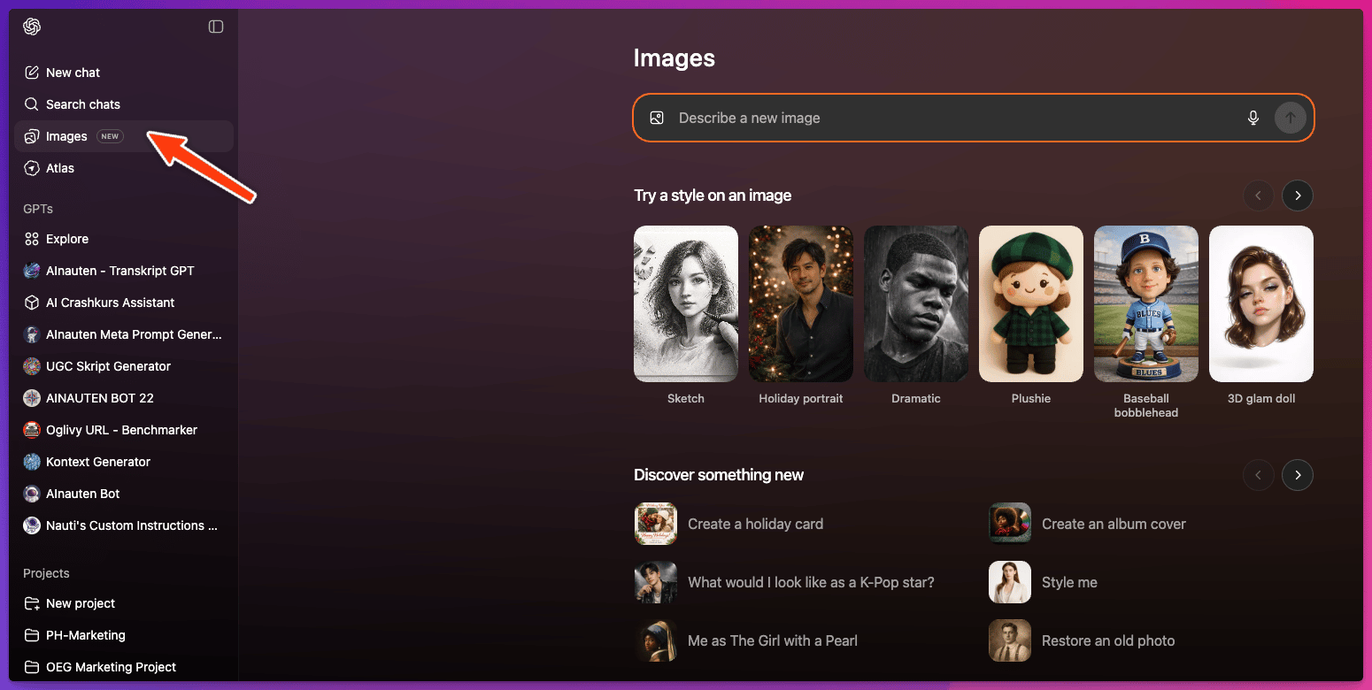 Einfach im Reiter “Bilder” klicken - dort findest du eine komplett neue Bilderfahrung mit vordefinierten Styles, Inspirationen und deinen eigenen generierten Bildern.