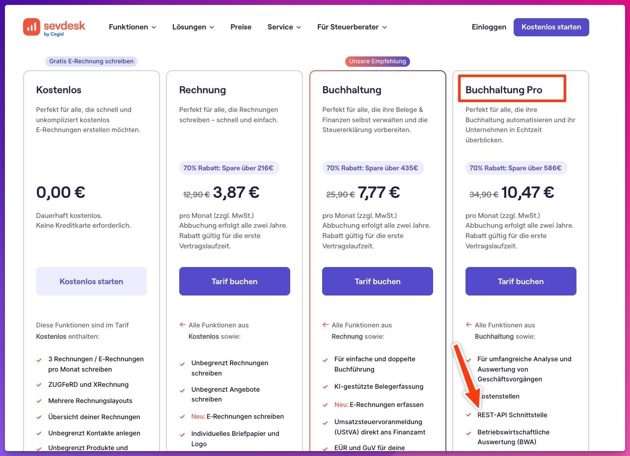 Wichtig: Für die API brauchst du die Buchhaltung Pro Stufe. Da wir sevdesk als Partner gewinnen konnten, gibt es darauf satte 70% Rabatt. Sprich: die höchste Stufe liegt bei ab 10 Euro pro Monat, siehe unten.