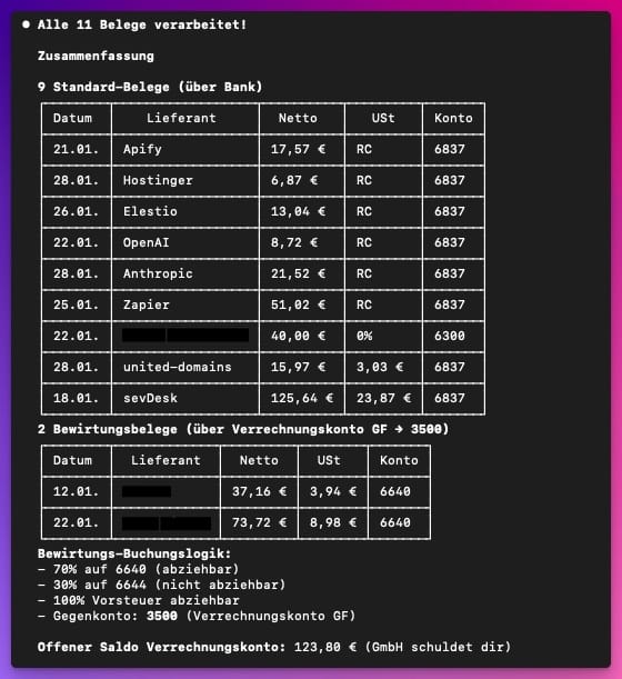 Claude fragt nach dem API-Key, wo die Belege liegen, welche Buchungslogik genutzt wird und dann legt er auch schon los.