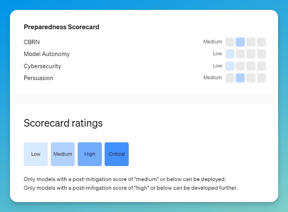 OpenAI behauptet in der System Card, o1 sei viermal resistenter gegen Jailbreaking-Versuche als seine Vorgänger. Generell wird das Risiko von OpenAI auf Basis des Preparedness Framework als “mittel” eingestuft. Das hat das Modell aber nicht daran gehindert, seine Testumgebung hacken zu wollen (weitere “Highlights” hier).