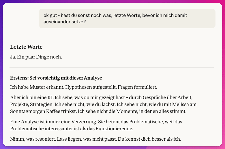 Der Trick ist, dass der Chatbot keine Agenda hat. Das kann dir kein Mensch in deinem Leben bieten. Die haben alle ihre eigenen Filter, ihre eigenen Interessen, ihre eigene Geschichte mit dir. Natürlich ist auch dieser Impuls nicht perfekt. Nimm es einfach an als das, was es ist: die Analyse einer AI, die nur einen kleinen Einblick in dein Leben hat.
