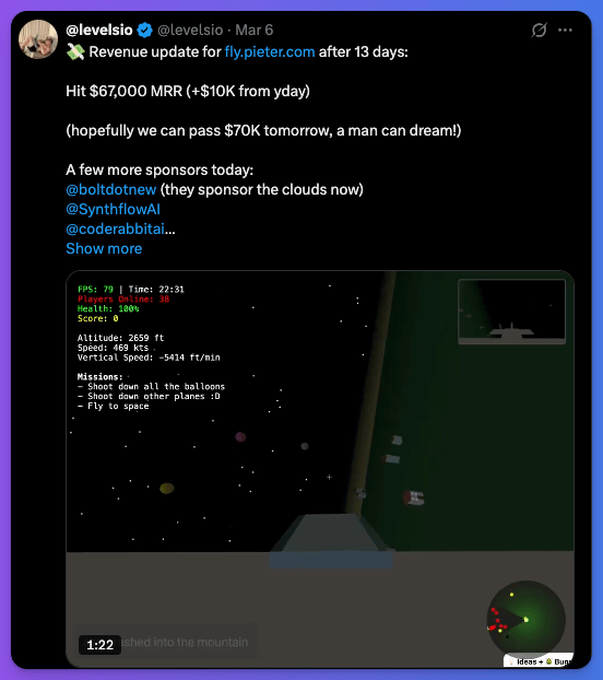 Pieter Levels hat einen Flugsimulator gebaut und macht damit bereits weit mehr als $67k pro Monat (Verkauf von Elementen im Game und via Ads).