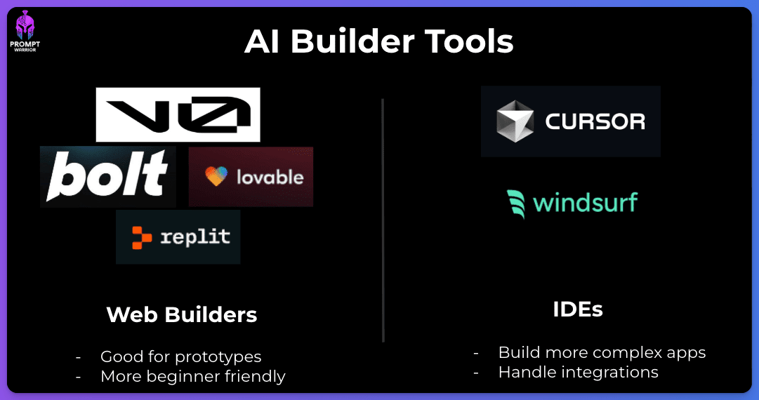 Web Builder sind die Tools, die du direkt im Browser nutzen kannst, während IDEs (Integrated Development Environments) lokale Anwendungen sind, um damit Code zu generieren. (Btw, ChatGPT auf dem Desktop kann jetzt auch Code direkt editieren).