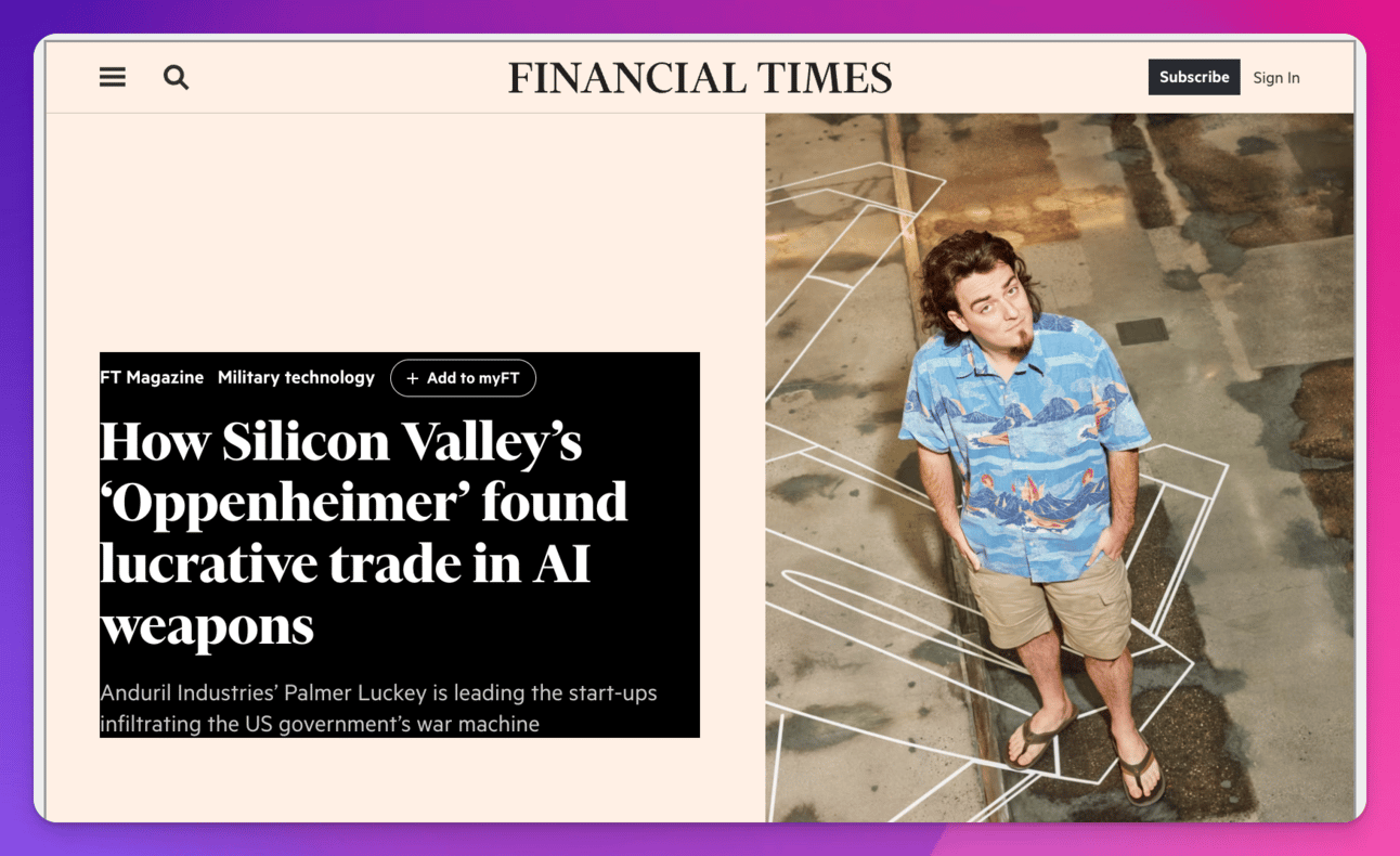 Ein spannendes PortrΓ€t von Palmer Luckey, dem GrΓΌnder von Oculus und nun CEO von Anduril Industries. Er handelt mit AI-Waffen und infiltriert die Kriegsmaschinerie der US-Regierung.