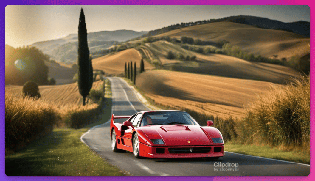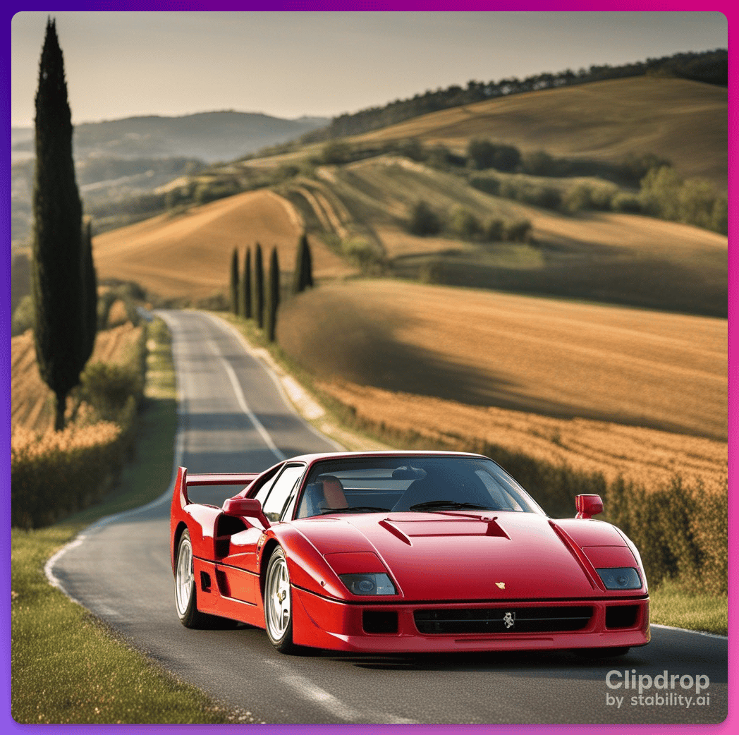 Capture a stunning image of a Ferrari F40, the iconic red sports car, on a scenic road in Tuscany.