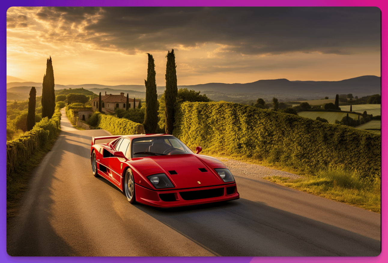 Wir haben folgenden Prompt fΓΌr einen Ferrari F40 verwendet (erweitert mit dem ChatGPT Plus Plugin Photorealistic):
